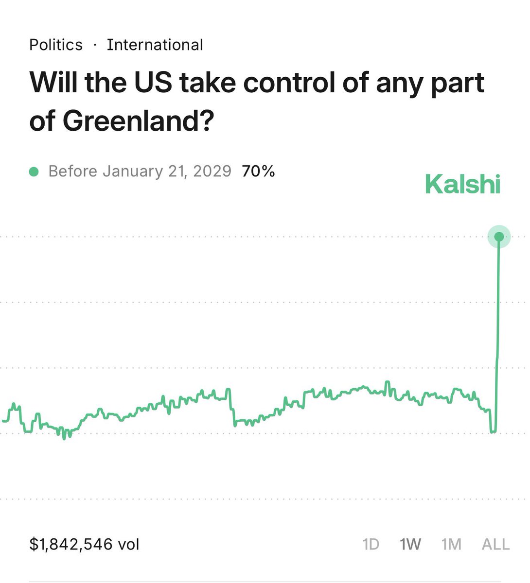 押注市場最新數據,美國控制格林蘭島的機率猛增到70%。