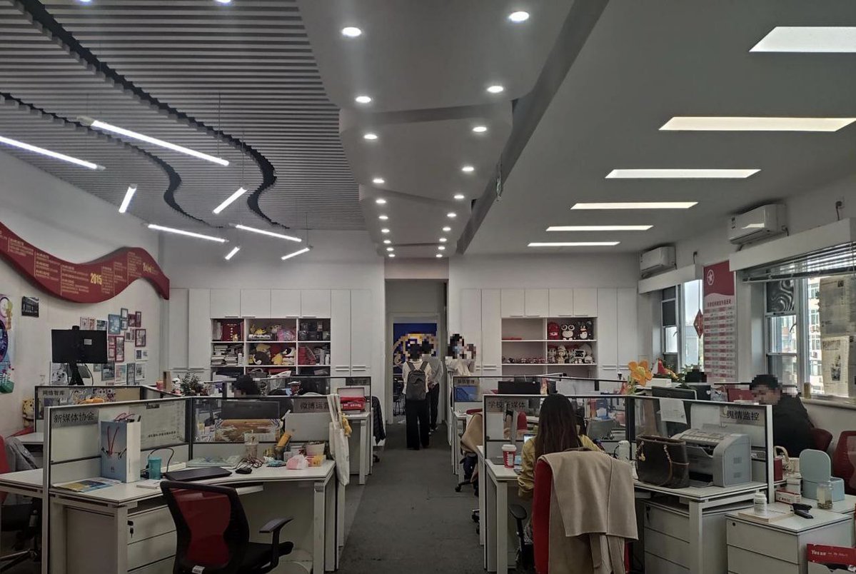 空调恒温、工位宽敞、人均多屏、茶水间齐全,背景墙上还挂着“正能量传播”的标语。