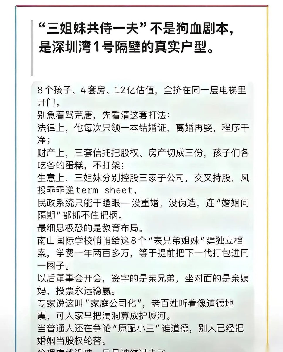能让三姐妹共侍一夫的上市公司董事长,的确很有一套:他在法律框架内尽可能得保障了三姐妹和八个孩子的绝对公平,这才是三姐妹团结一致的基础。