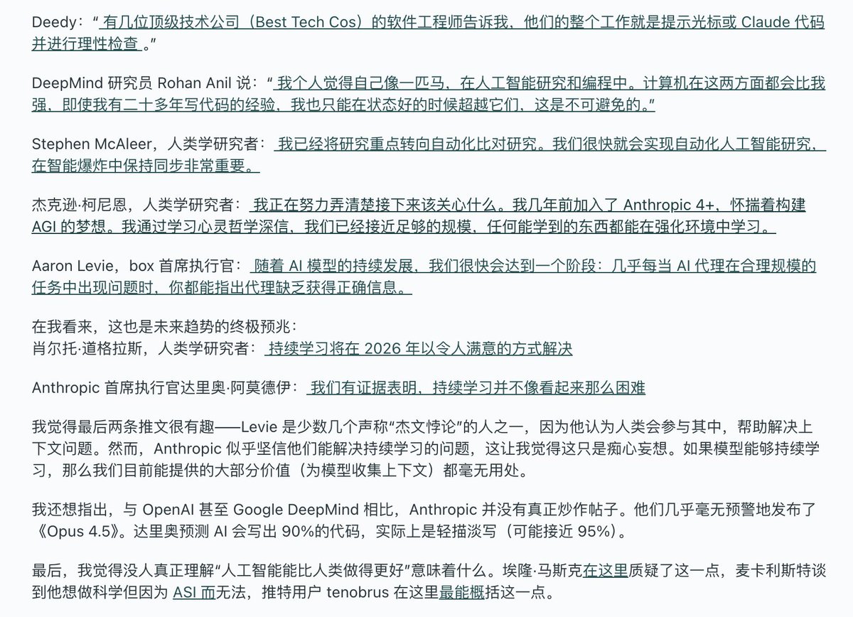 问题开始浮出水面:如果模型继续进步,解决了上下文窗口、持续学习(Continual Learning)这些最后的限制,人类当前在知识工作中提供的大部分价值——理解背景、整合信息、形成判断——是否都会被系统性地压缩掉?而这并不是边缘人的幻想,Anthropic 和 DeepMind 的研究员们正在公开表达类似的困惑:有人转向“自动化对齐研究”,有人坦言“不知道接下来该在乎什么”。