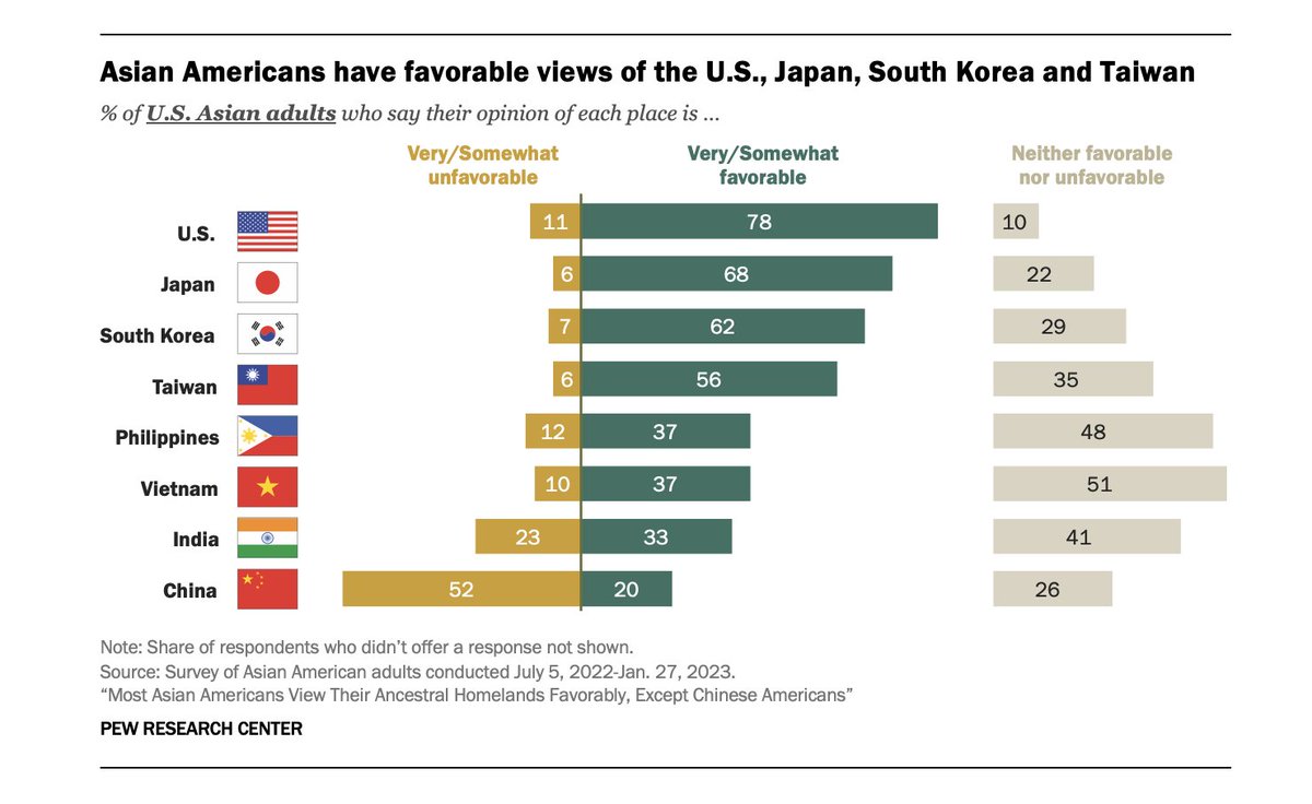 基于皮尤研究中心2023年发布的《亚裔美国人对其祖籍国的看法》报告,对海外华人群体对母国持负面或批判态度这个现象背后的底层逻辑与群体心理进行数据层面的拆解与提炼。