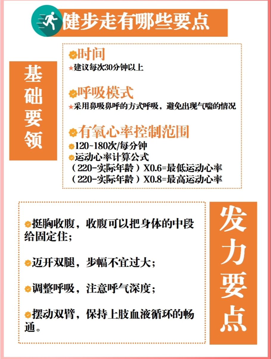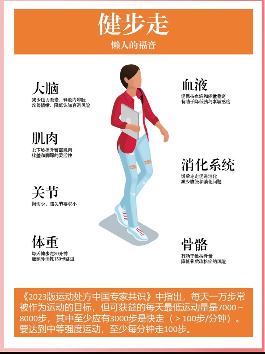 4. 循序渐进:初学者可从每天10~15分钟开始,逐步增至每次30分钟以上,目标每周至少150分钟中等强度步行。