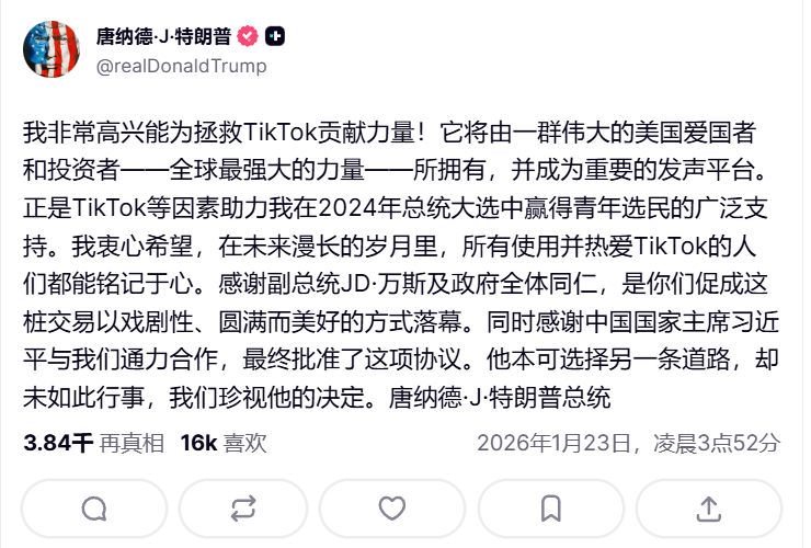 1月23日,TikTok美国拆分方案落地,特朗普发文庆祝,并表示TikTok接下来将由美国爱国者们拥有。他同时感谢习近平最终批准了这项协议。