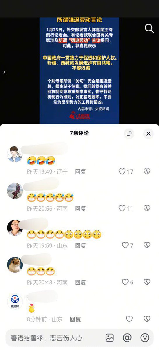 1月24日,中央政法委机关报《法制日报》转发了外交部驳斥联合国专家所谓“强迫劳动”言论的视频。