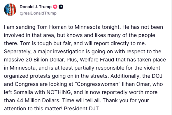 川普:我今晚派汤姆·霍曼去明尼苏达州。他之前没有参与过那个地区的事情,但他认识那里很多人,也很喜欢他们。汤姆为人强硬但公正,他会直接向我汇报工作。