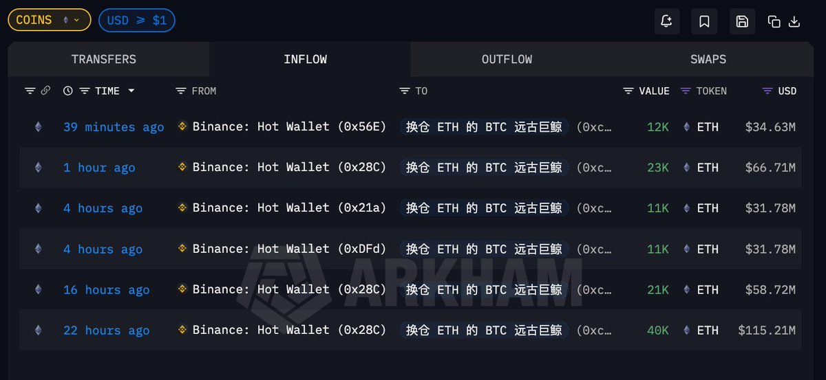 🟢 新地址 0xcA0…b2998 过去 22 小时累计从 #Binance 提出 11.8 万枚 ETH,总价值 3.38 亿美元,平均提出价格 $2871.4 https://t.co/jla2GPeZml