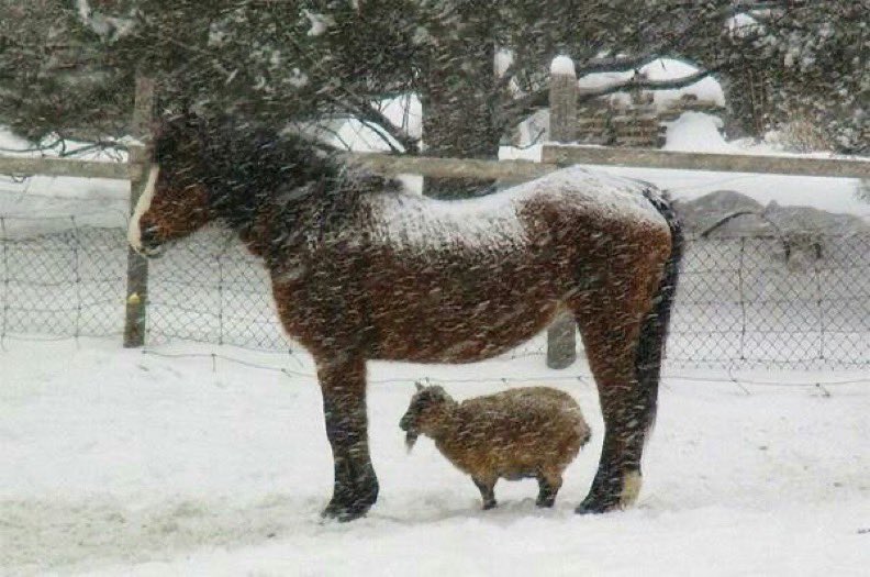 Horse with Goat standing under it providing shelter for lil friend protection from cold.