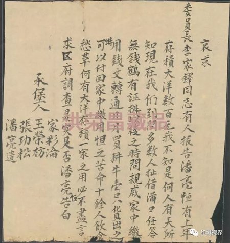 接到区苏维埃政府派款公函后,潘亮恒觉得很冤枉,于是找到乡里比较了解情况的几个人作证明,给区政府写了一封哀求信(图 3 )。要求苏维埃政府调查弄清家庭经济情况,并且,还请潘亮遗等 4 个人证明。
