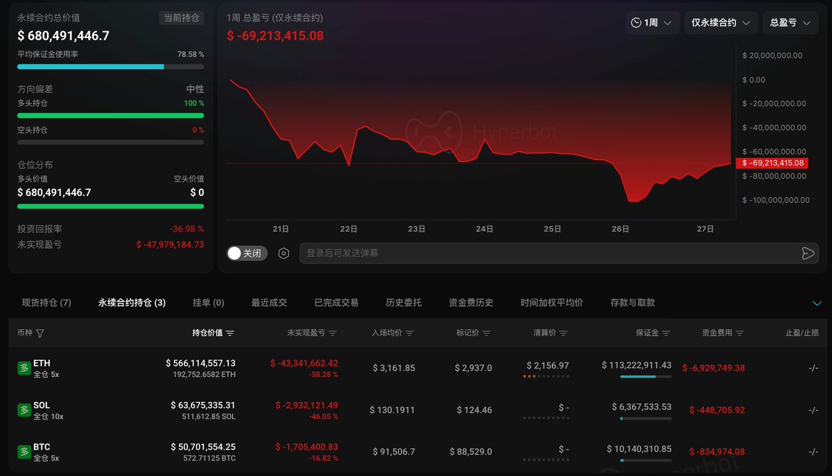 做多没有前途,还是买现货更直接🙌「1011 闪崩后开空内幕大佬」似乎正在逐渐减仓多单换为现货,昨晚起他在 Hyperliquid 上的动作如下👇▶︎ 减仓 1.4 万枚 $ETH 并亏损 362.4 万美元▶︎ 减仓 427.28 $BTC 并亏损 161.2 万美元目前已将多头头寸降至 6.8 亿美元,浮亏 4797