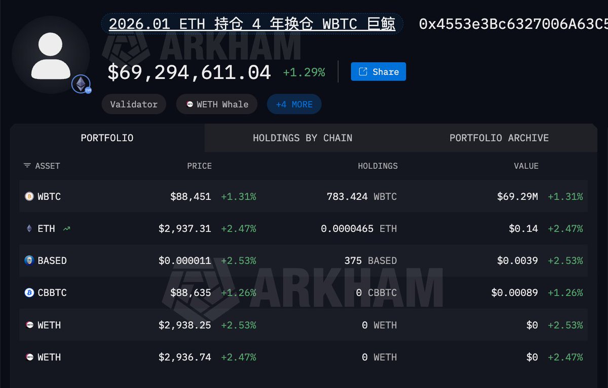 5000 多万美金就这么来回倒腾做汇率是吧😂「 $ETH 持仓 4 年换仓为 $WBTC 的巨鲸」又双叒把 WETH 换回 WBTC 了🔸01.03:将 14145.93 WETH 换仓为 492.16 WBTC(4419.5 万美元),ETH/BTC 兑换比例 0.03479🔹01.26:将 578.66 WBTC 换回 17706.74 WETH(5033 万美元),ETH/BTC 兑换比例 0.03268