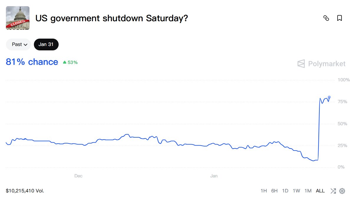 目前Polymarket上押注新一轮停摆的概率从上周五的不到10%升至81%。