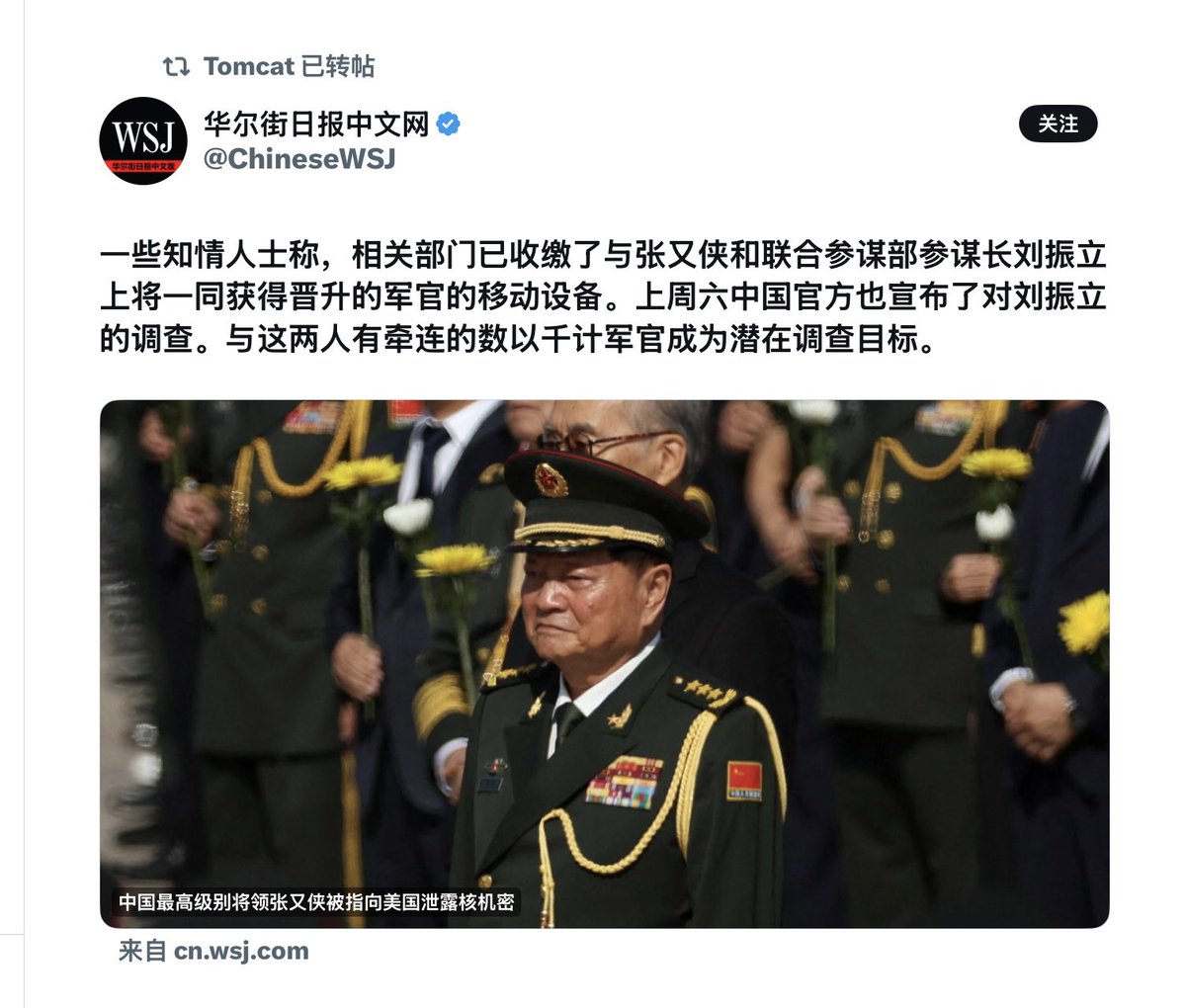 华尔街日报:相关部门已收缴了与张又侠和联合参谋部参谋长刘振立上将一同获得晋升的军官的移动设备。