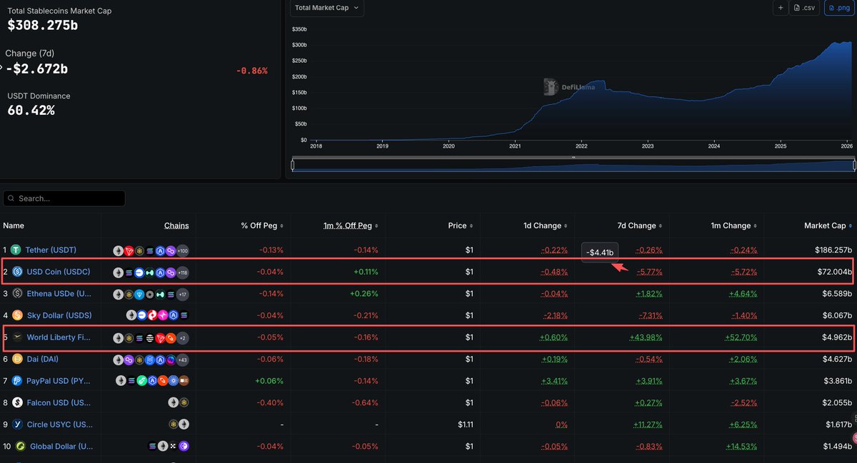 刚刚去看了一下Defilima上的稳定币数据,貌似 @USDC 日子的确过的有点惨,过去7天流出超过40亿美金,而同时期 $USD1 流入15亿,增长43%。