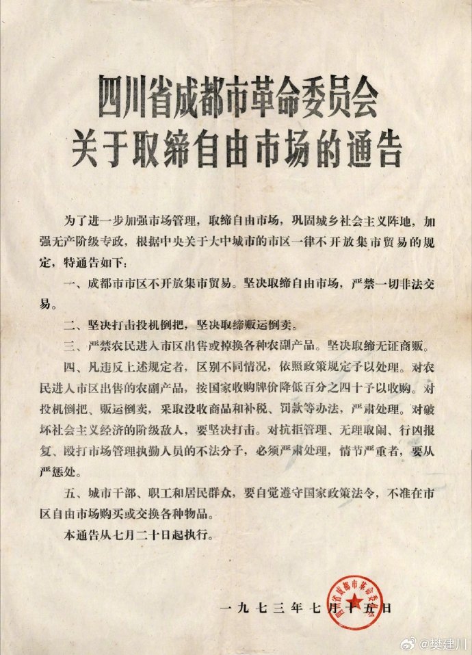 70年1月周起草毛圈阅发出”关于打击反革命破坏活动的指示“,2月发出“关于反对贪污盗窃投机倒把的指示”和“关于反对铺张浪费的通知”,开展套在探索大运动中的“一打三反”小运动。这个小运动死刑下放到县,关了284800人,直到73年9月22日才宣布胜利结束。这张通告,就是在辉煌胜利之前再冲业绩