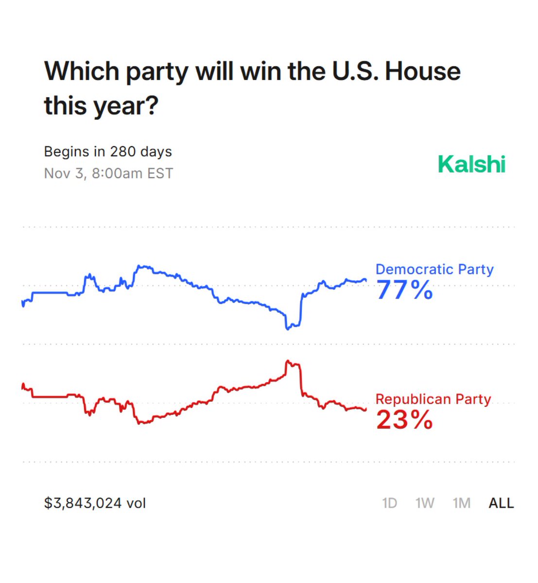 UNITED STATES: The Democratic Party has 77% chance of winning the House of Representatives this year, compared to 23% for the Republicans, according to prediction market