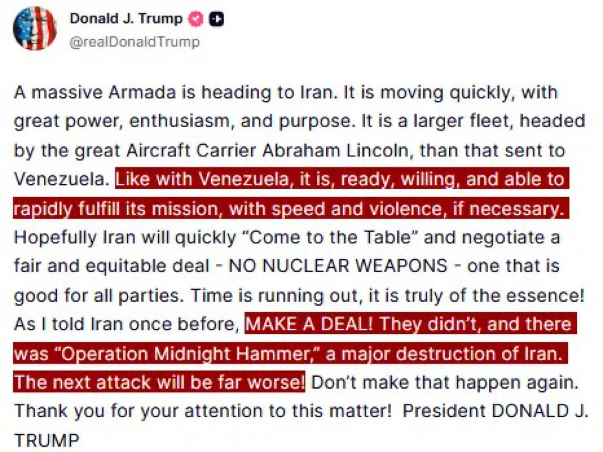 最新消息——川普称“一支庞大的舰队正驶向伊朗”,呼吁伊朗“回到谈判桌前”达成协议,否则“下一次袭击将会更加惨烈!不要让这种事再次发生。”