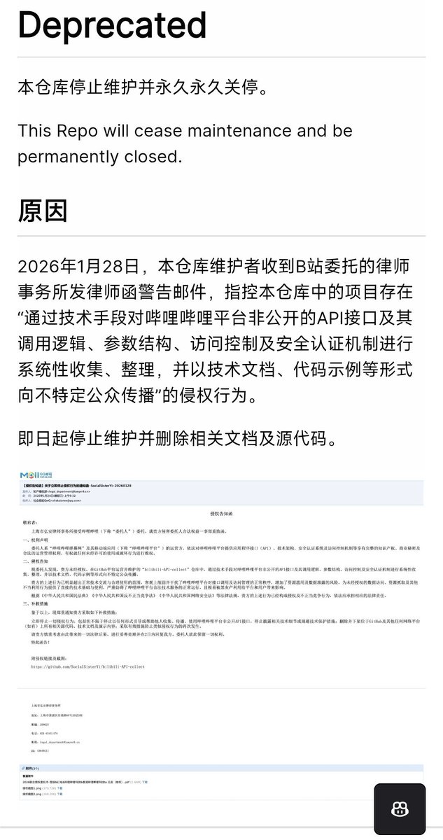 网友投稿:1月28日,B站发送律师函要求下架GitHub上的一个B站官方API收集整理项目。