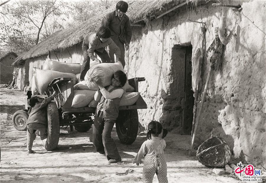 1979年秋,安徽省凤阳县小岗村,农民严宏昌用借来的拖拉机拉回自家丰收的粮食。1978年11月24日,小岗生产队18户农民以托孤方式偷偷搞起了农业“大包干”,“交足国家的,留足集体的,剩下都是自己的”。 汪强 摄