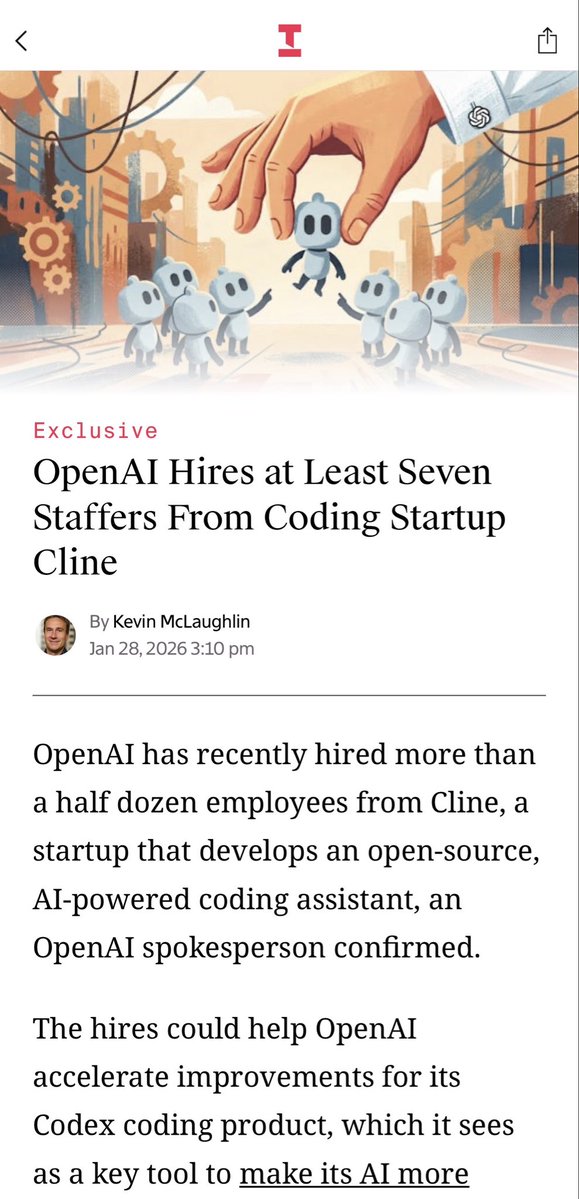 原来OpenAI上次收购windsurf失败后跟google学精了,只买人不买公司😂OpenAI 从编程初创公司 Cline 挖走至少七名大将OpenAI 的一位发言人刚刚证实,公司最近从 Cline 挖走了超过半打(至少 7 名)的员工。Cline 究竟是何方神圣?它是一家开发开源 AI 编程助手(AI-powered coding