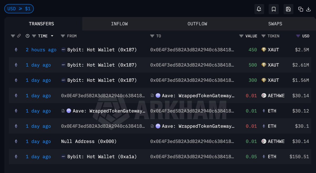 新地址似乎终于忍不住了,昨天起分批从 #Bybit 提出 1250 枚 $XAUT ,总价值 667.3 万美元;看黄金连涨三个多月,这下不焦虑了