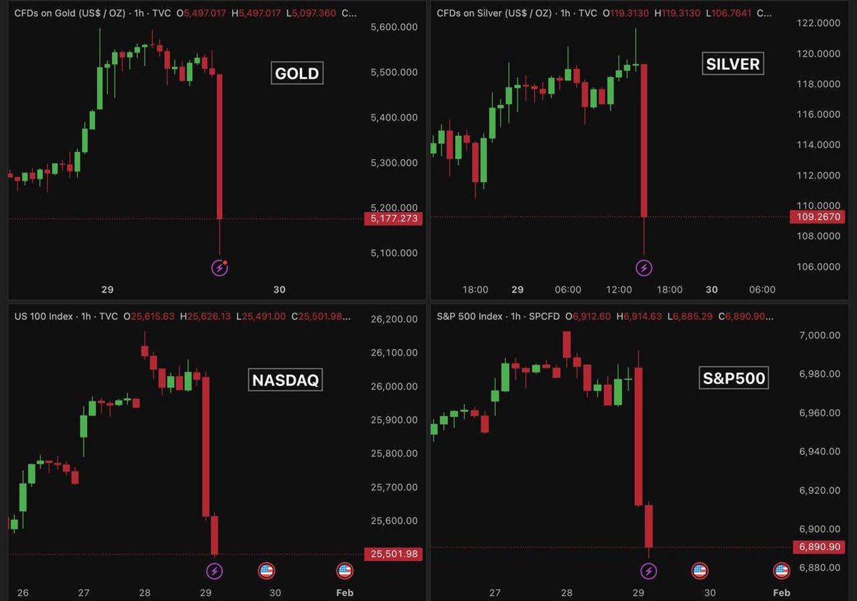 📉 市場上僅在一小時內,黃金、白銀和股票市值就蒸發了超過6萬億美元,而這一切的發生似乎毫無緣由。