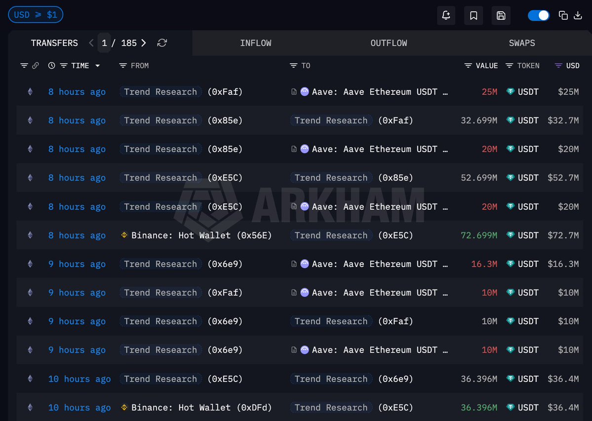 易老板还买 $ETH 吗,暂时应该是不买了🤔 过去 9 小时 Trend Reseach 累计从 #Binance 提出 1.09 亿枚 USDT,包括 01.28 充值进币安的 8000 万枚 USDT,目前这笔资金已存入 Aave 以降低清算风险;易老板手上的 661,272.65 枚 $ETH 目前浮亏 1.92 亿美元(成本 ~$3,104.36) 钱包地址 https://t.co/oHN4srri1p 本文由 @Gate_zh 赞助 |上 Gate App 抢黄金