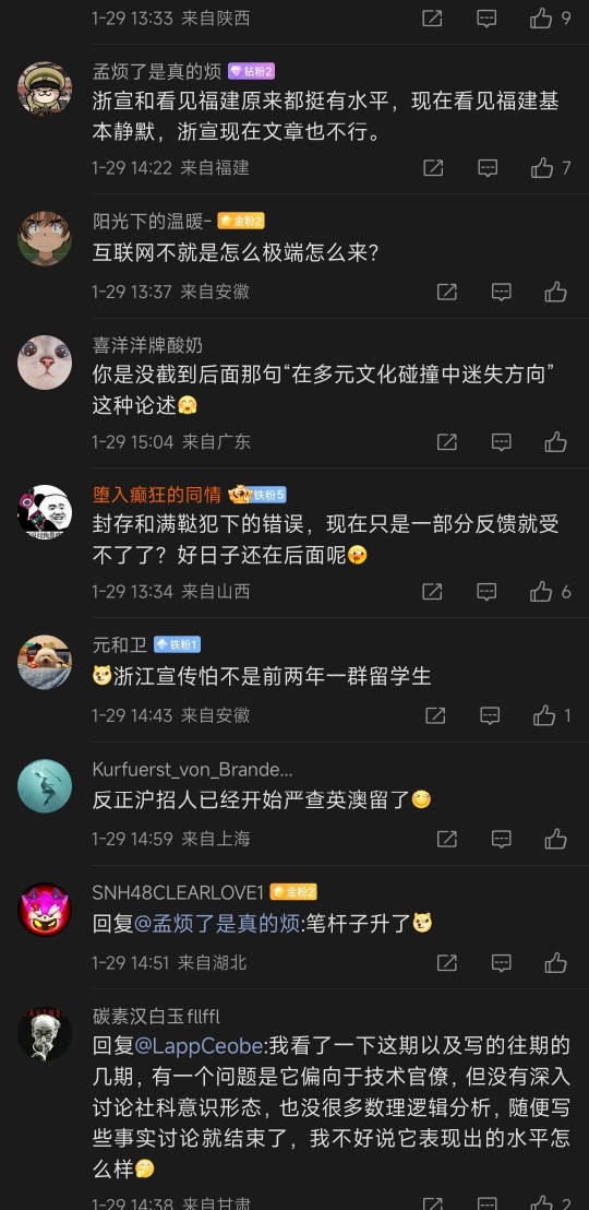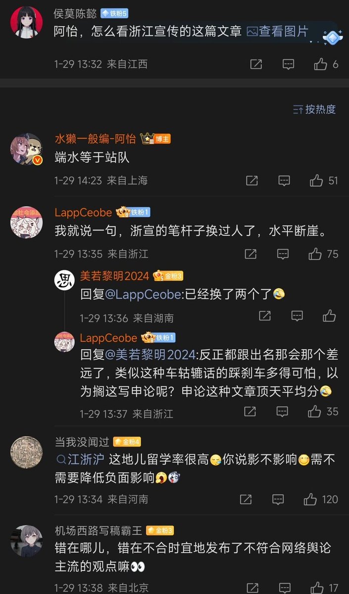 观察者网军工组王世怡和 #牢a 铁粉,在微博和知乎抗议浙江宣传点名批评牢a的行为,说是中共浙江省委宣传部有少爷千金破防了🤔