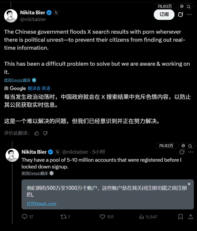X 负责人Nikita公开承认目前 X上的中文搜索被中国政府操纵: