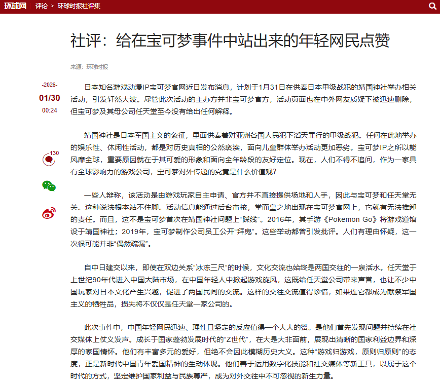 针对这一事件,《环球时报》发表社评,对挺身而出的中国年轻网民给予高度评价。社评指出,年轻一代在第一时间发声,态度迅速、理性且坚定,在涉及历史是非和国家立场的问题上,展现出清晰的国家利益边界和深厚的家国情怀。“游戏归游戏、原则归原则”,这种分寸感和价值判断,正是新时代中国青年爱国精神的生动体现。社评认为,这些年轻网民善于运用数字技术和社交平台,以符合时代特征的方式表达立场、捍卫尊严,既有情绪温度,也守住理性底线,正在成为对外交往与公共议题讨论中一股不可忽视的新生力量。