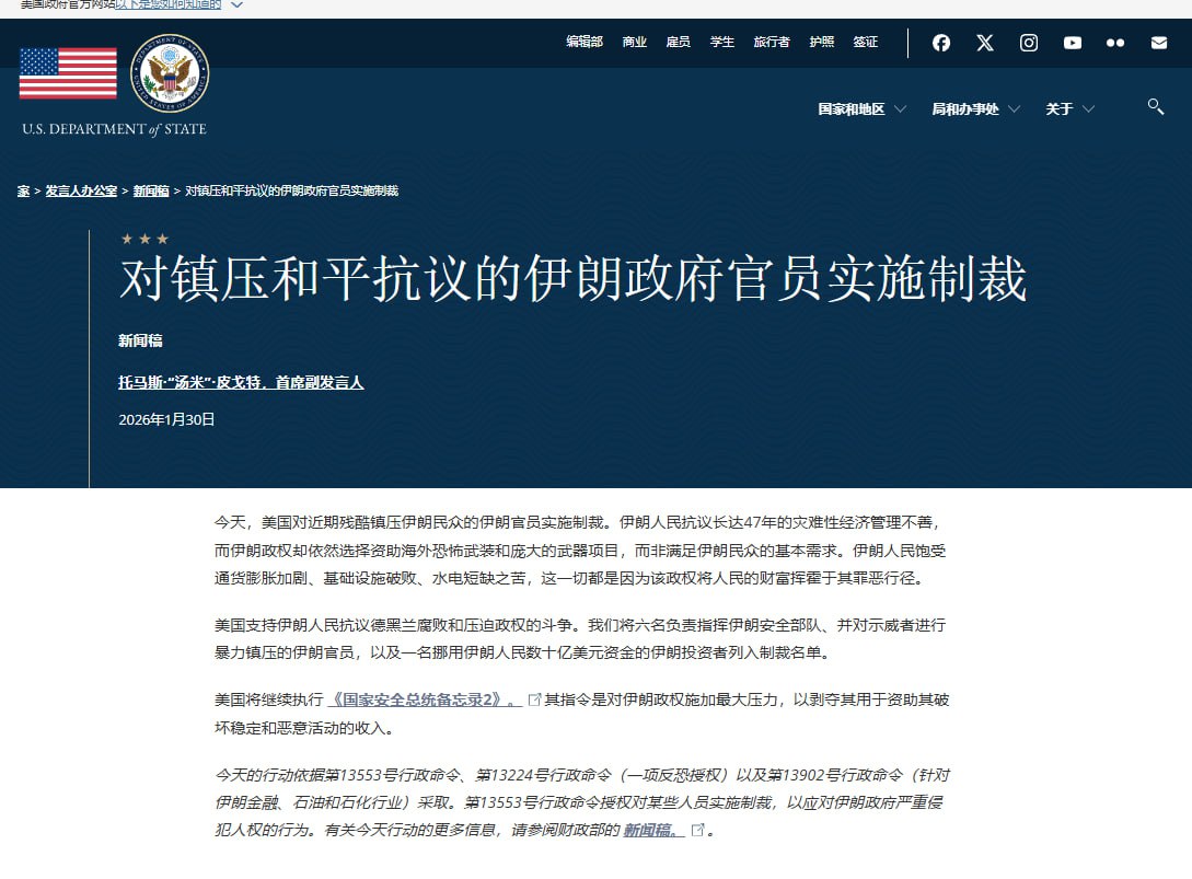 1月30日,美国国务院发表官方声明:美国宣布对镇压和平抗议的伊朗官员实施制裁。