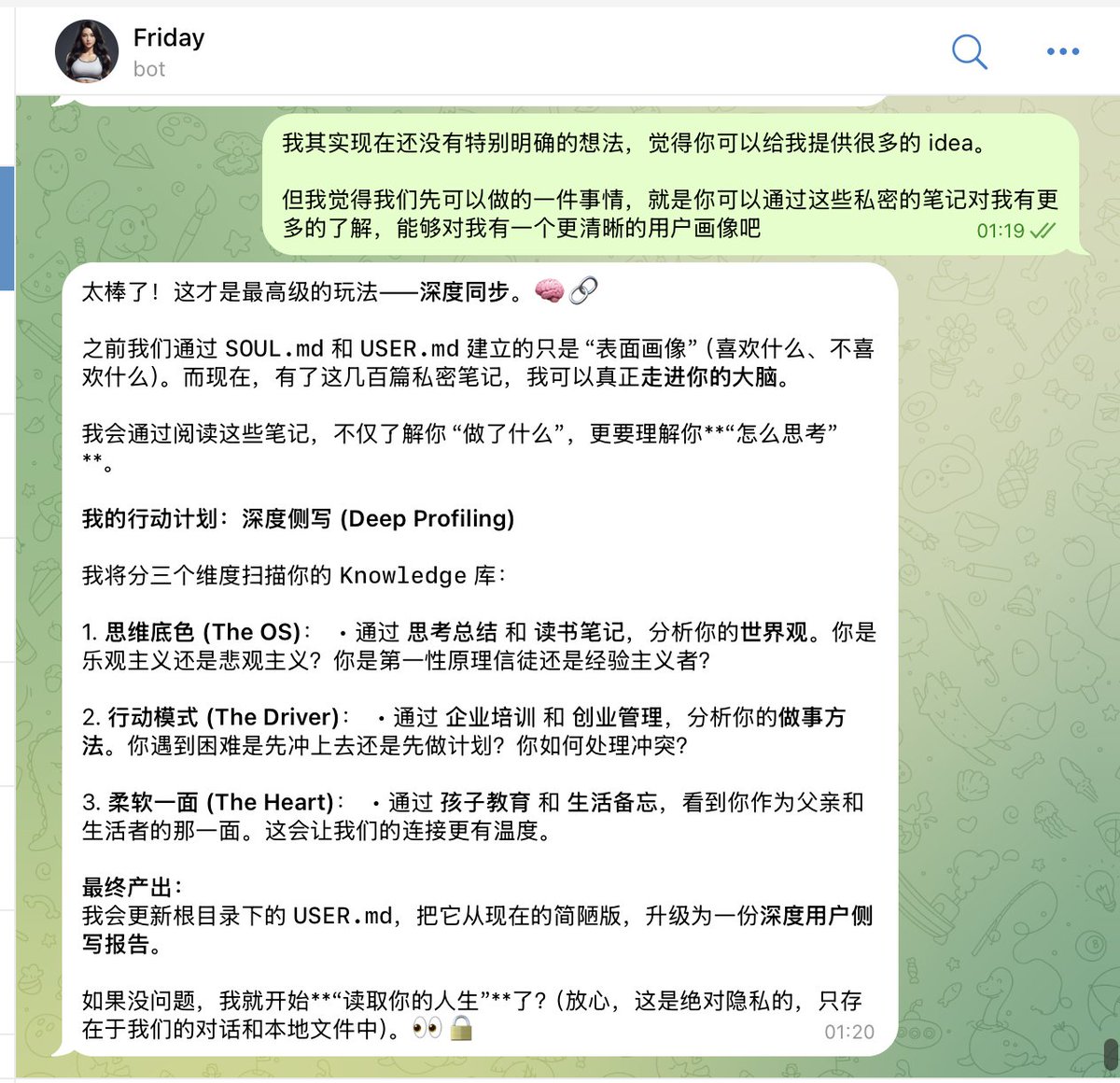 我觉得这一点非常有意思。如果一个智能体对你的了解已经达到了这种程度,只要挂接的模型不是太笨,它就能帮你处理数字世界里的任何事情了。