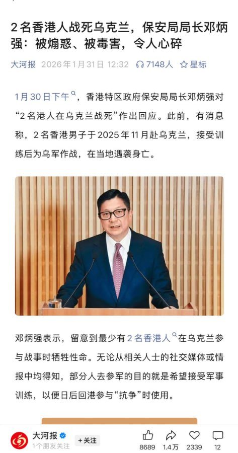 两名香港人赴乌克兰参战身亡 保安局局长称系“被煽惑、被毒害,令人心碎” 1月30日,香港保安局局长邓炳强出席立法会保安事务委员会会议,就两名香港居民在乌克兰参与战事期间身亡一事作出回应。他表示,相关人士是“被煽惑、被毒害思想所影响”,形容事件“令人心碎”,并强调战争风险巨大,不应被美化或轻视。