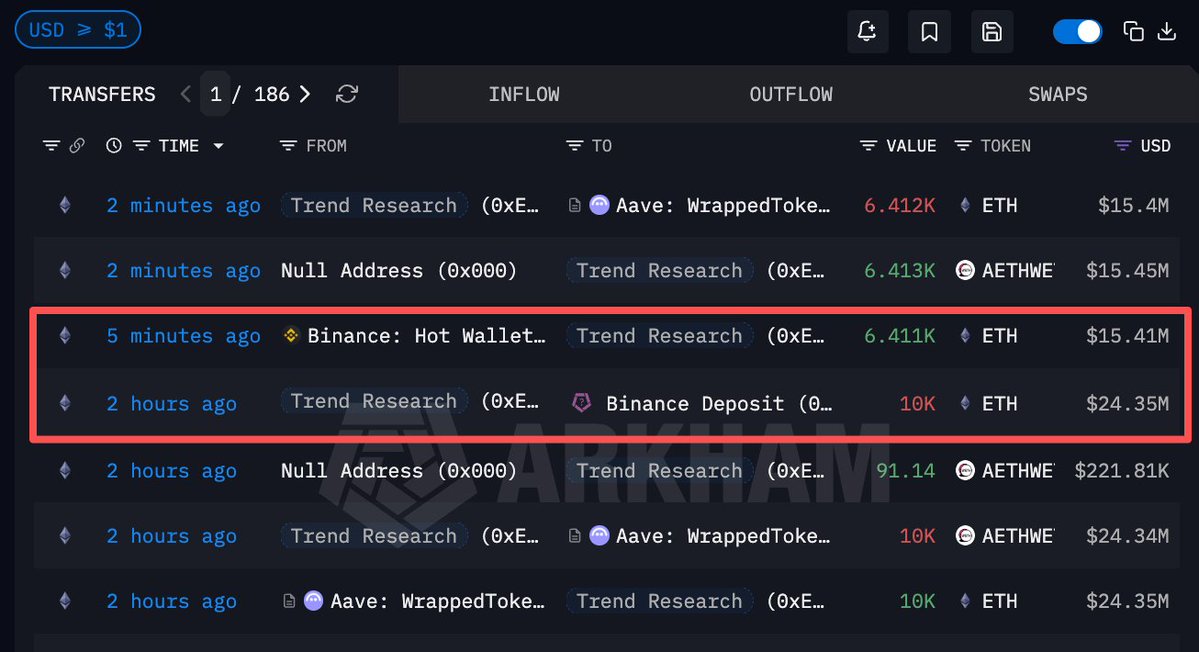 Trend Research 2 小时前将 1 万枚 $ETH 充值进币安后,5 分钟前又提出了 6411 枚 ETH(1541 万美元);这是觉得卖掉一部分降低杠杆压力就可以了吗