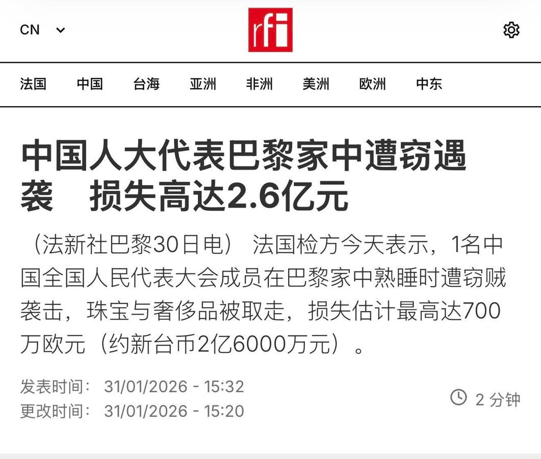 1月30日,法国检方表示,一名中国全国人大代表在巴黎家中熟睡时遭窃贼袭击,珠宝及奢侈品被夺走,损失估计达6、7百万欧元(约5200 万-5300 万人民币)
