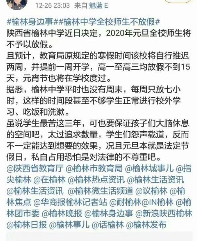 网友投稿:陕西榆林中学并非是第一次试图在寒假前缩短学生的寒假,在2020年他们就试图强行缩短学生寒假,并且也同样遭到了学生的强烈抗议,最终学生抗议浪潮阻止了校方试图缩短寒假。