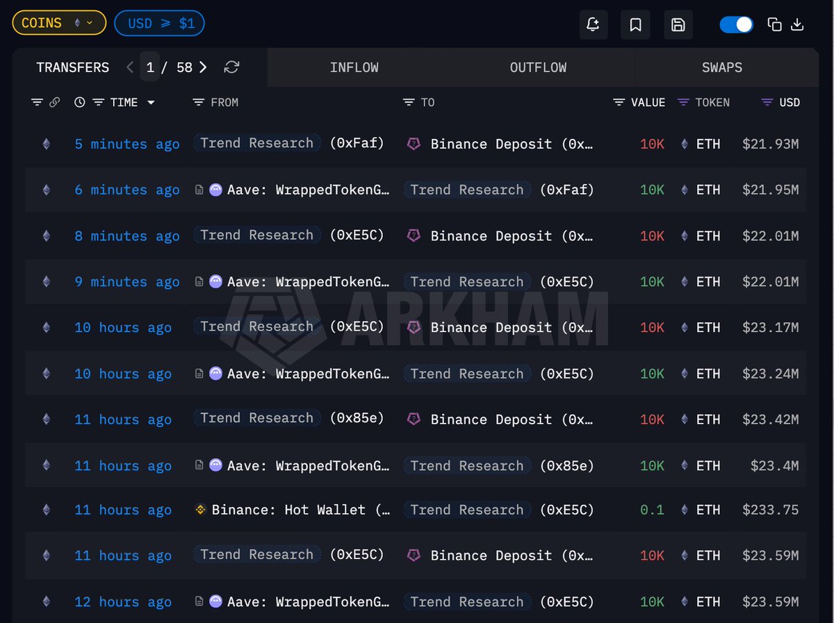 为避免被清算,Trend Research 再次向 #Binance 充值 20000 枚 ETH,过去 24 小时已累计向交易所充值 53,589 万枚 ETH,若卖出将亏损 4267 万美元