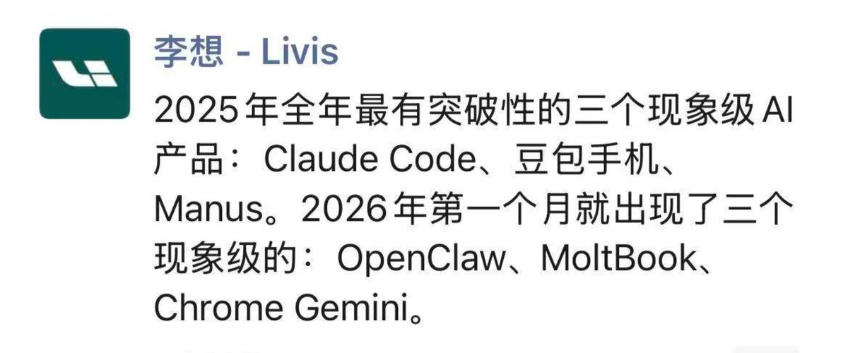 李想刚发了条朋友圈,盘点 2025 到 2026 年初最具突破性的 AI 产品:Claude Code、豆包手机、Manus、OpenClaw、MoltBook、Chrome Gemini。
