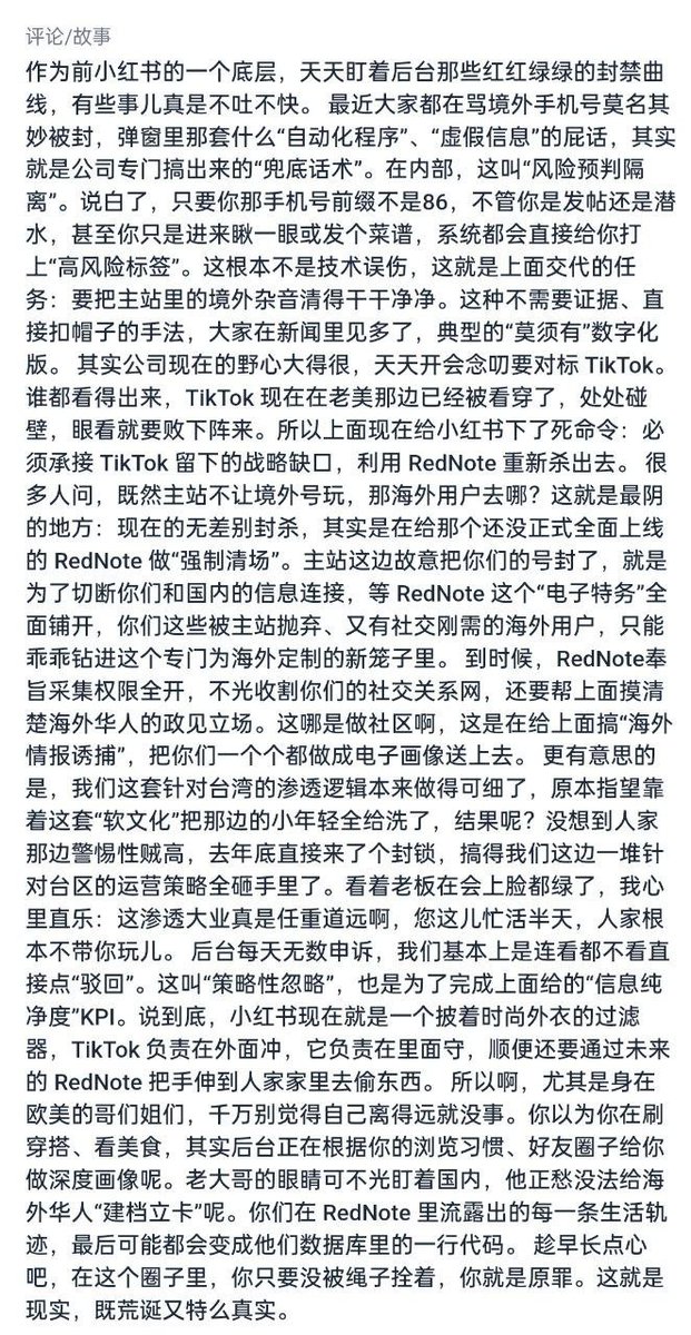 爆料还提到,这一做法与公司战略调整有关。内部会议多次提及要“对标 TikTok”,并承接其在海外受阻后可能留下的市场空间。在此背景下,小红书主站被要求提高所谓“信息纯净度”,对境外账号进行无差别清理。