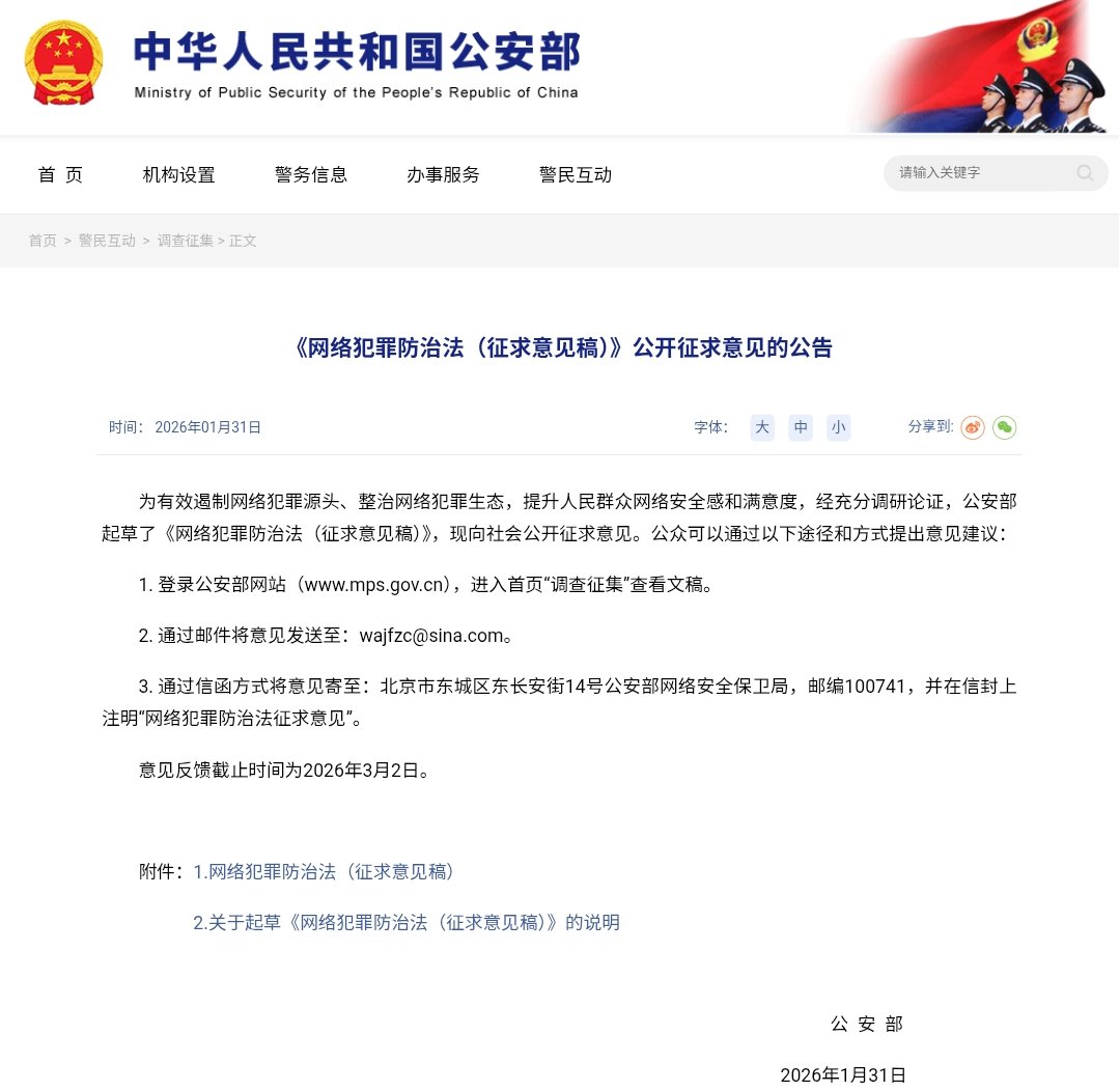 【警权扩张与数字围墙:解析《网络犯罪防治法》草案的全球野心】1月31日,中国公安部发布了《网络犯罪防治法(征求意见稿)》,标志着中国互联网治理模式正从网信办主导的行政管理,正式转向由公安部牵头的“警务主导”模式。公权力的触角不再局限于境内,而是试图构建一套对内严防死守、对外长臂管辖的全球监控体系。