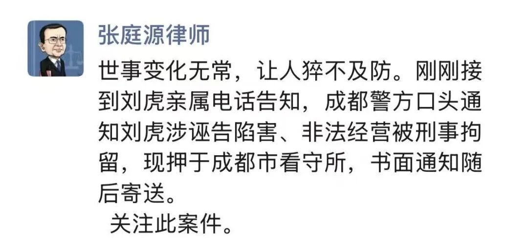 “好快的速度,好大的面子” 2 月 2 日,据多家媒体及法律界人士消息,中国知名媒体人、前调查记者刘虎因涉嫌“诬告陷害罪”“非法经营罪”,被成都市公安局依法刑事拘留,目前羁押于成都市看守所。 消息称,刘虎此前与另一名自媒体人巫英蛟联合发布文章《曾逼死教授的四川县委书记,如今又把招商企业逼向破产》,内容涉及四川省蒲江县县委书记招商引资相关问题。文章发布后,两人被四川警方带走调查。目前,巫英蛟仍处于失联状态。
