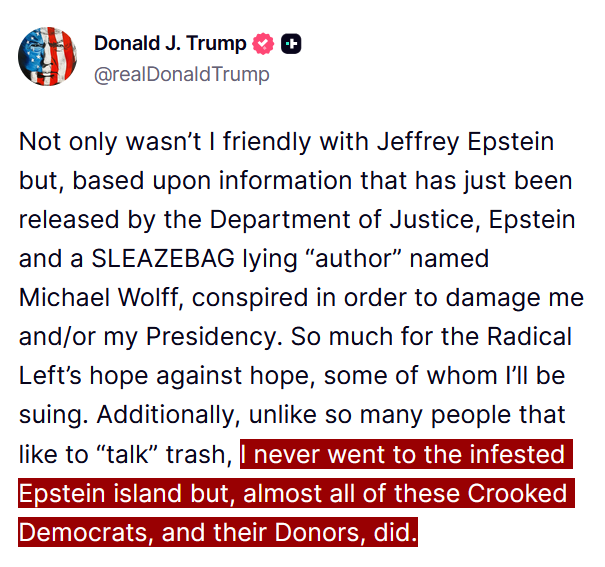最新消息——川普:“我从未去过那个藏污纳垢的爱泼斯坦岛。”