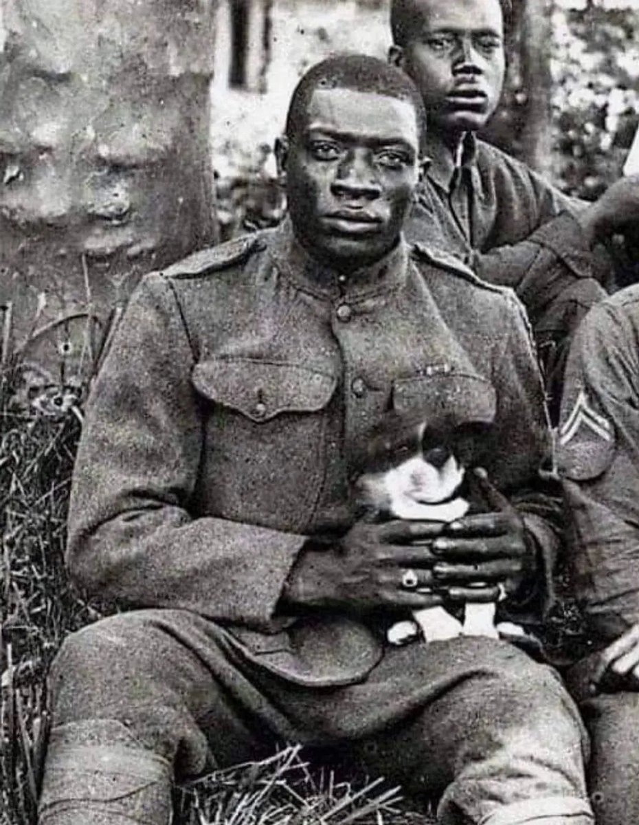 A Harlem Hellfighter who rescued a puppy during WWI poses for the camera, 1918