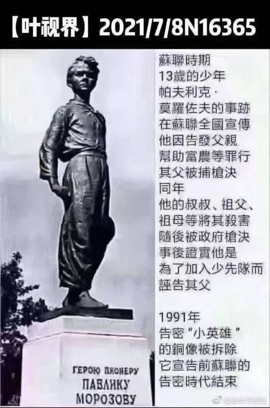 中国也有一位同样的小“英雄”,他叫张红兵,他告发了自己的母亲,他母亲被枪毙了。,,(张红兵:没有地址的信——给我的妈妈方忠谋一妈,我终于给您写信了。作为您的长子,我知道您是 安徽枞阳(原属桐城)石婆附近高塥村人,曾用名“忠模”: