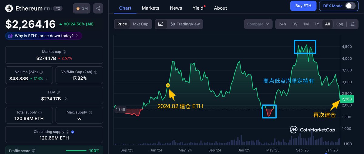 时隔 2 年再次苏醒并囤积 ETH,期间跌到 $1522 不卖,涨到 $4461 也不卖,忍者啊🥷地址 0xF78…04d25 和地址 0x5F4…17f86 疑似归属于同一人,最近一次买入 $ETH 是 2024.02,成本约 $2631.88然而 7 小时前突然以均价 $2174 在链上买入 4020.61 枚 ETH(价值 874 万美元),目前共持有 5122