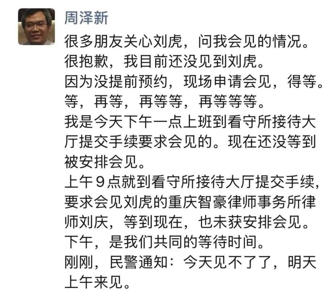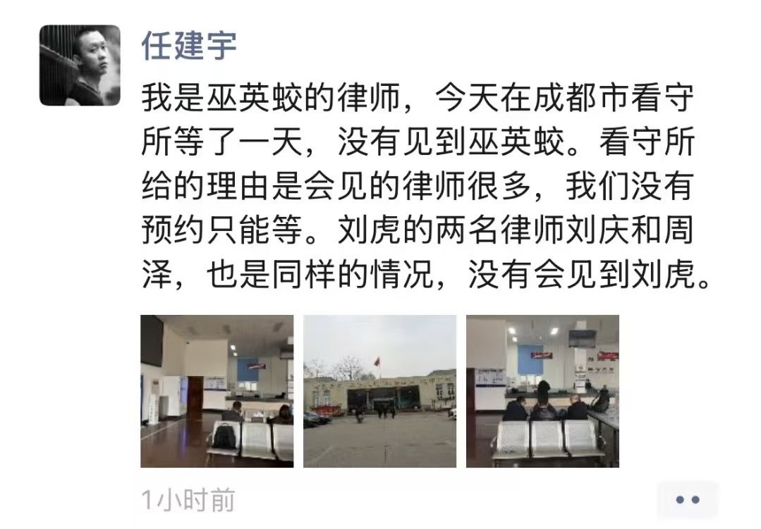 2月3日,刘虎、巫英蛟的律师在成都市看守所等了一天,均未获得会见。