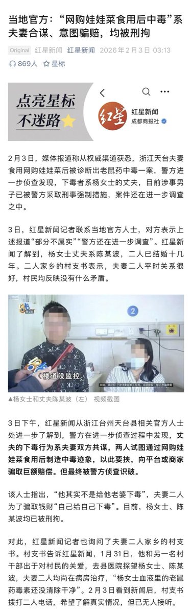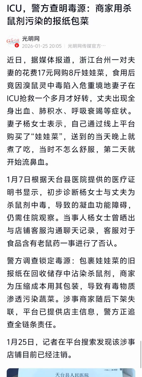 近期一个一波三折的新闻。夫妻俩吃了拼多多上买的娃娃菜,农药中毒,住ICU一个月差点丧命。一开始说是无良商家用浸透了农药的报纸包娃娃菜导致。结果商家跑路,拼多多新鲜菜销量一落千丈。然后突然爆出消息,是丈夫在菜里下毒毒妻子,理由是他中毒很轻,妻子中毒很重。所以很可能是杀妻。