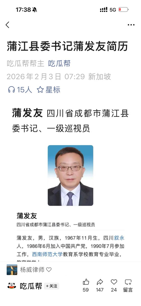 刘虎下一步会咋样,我不知道——我认为他终究会没事儿的,但这位蒲江县委书记蒲发友落马,我坚信是板上钉钉的事。