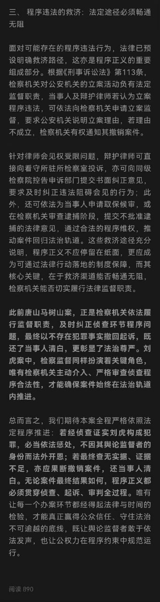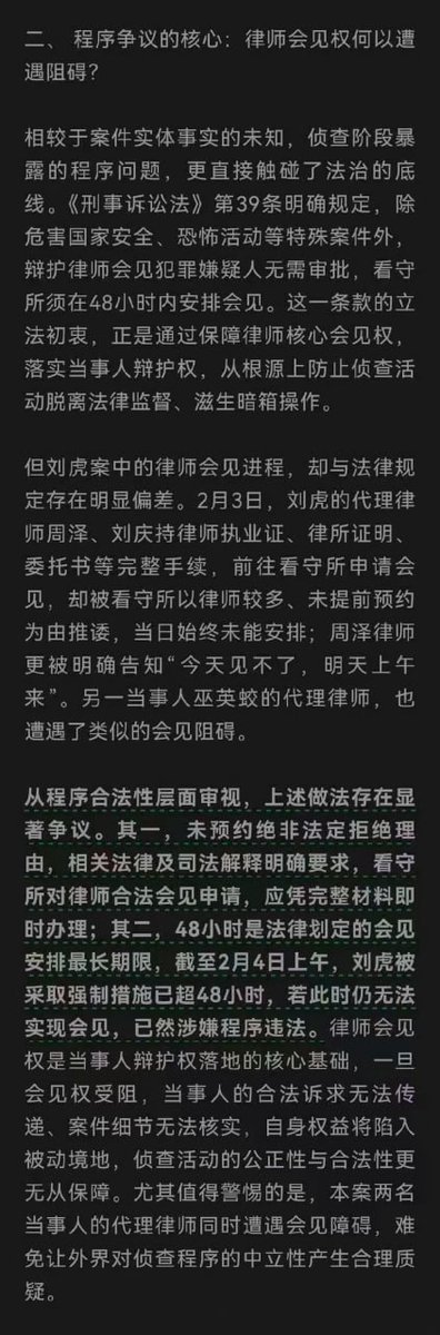 于建嵘还表示,按《刑事诉讼法》,本案并不属于需要审批的特殊案件,律师会见应在48小时内安排。但刘虎及其合作者的多名律师在手续齐全的情况下,被以“未预约、律师多”等理由拒绝或拖延会见,已明显偏离法律规定。于建嵘强调,律师会见权是防止刑事侦查失控的关键防线,一旦受阻,当事人权利和案件公正性都会受到实质性损害。