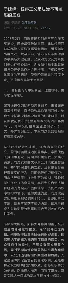 2月4日,中国学者于建嵘发文谈刘虎案,他表示,警方只公布了“诬告陷害罪、非法经营罪”的罪名,却未披露任何事实和证据,导致舆论猜测四起。公众有权要求侦查机关依法、透明地推进案件,不能用“侦查保密”来遮蔽程序问题。