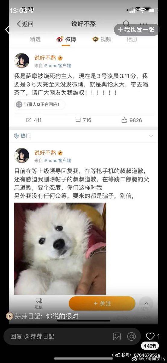 被两个小孩烧死的萨摩耶主人已经被控制了 不同的手机登陆她微博 发了一条和解信息然后光速关闭账号 这就是 #中国斩杀线 中国人的斩杀线是别惹天龙人